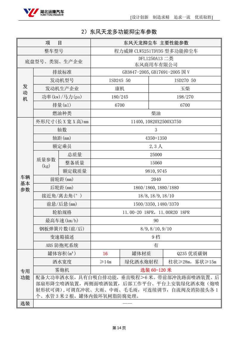 上裝配置:罐體容積為 15-18 立方多功能抑塵灑水車,選配風(fēng)送式霧炮機組射程50米、60米、80米、100米、120米,罐體鋼板為4mm碳鋼Q235材質(zhì),罐內(nèi)隔板具有防波作用,以減輕汽車行駛時罐體液體沖擊,罐體及整車外形尺寸按照公告。帶大功率專用灑水泵,泵可自吸自排,整車前沖、后灑、側(cè)噴、帶65消防接口,后平臺配CLW-50、CLW-60、CLW-80、CLW-100、CLW-120型風(fēng)送式霧炮機組;罐體前封頭配大功率柴油發(fā)電機組;遠程遙控系統(tǒng)控制;霧炮機自動旋轉(zhuǎn)角度0-360°。后平臺帶綠化灑水炮,灑水炮可全方位旋轉(zhuǎn),可連續(xù)調(diào)成直沖狀、大雨、小雨、毛毛雨;前封頭帶水位計,后平臺主管路帶1寸澆花接口,后爬梯。帶兩根輸水管及陰陽端。罐體顏色:銀/灰/綠,罐體兩側(cè)噴“多功能抑塵車”字樣,貼反光標示。